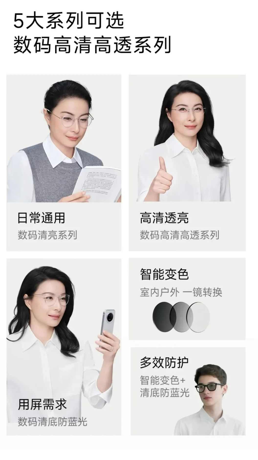 专供镜片中,包括数码清亮、数码高清高透、数码清底防蓝光、智能变色、多效防护、抗疲劳等多个系列产品,供“米粉”根据需求自由选择。