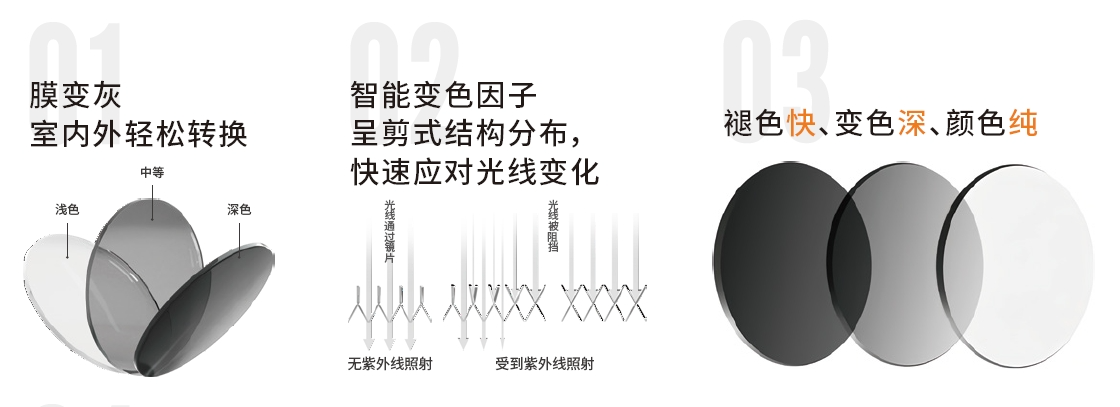 智能变色,顾名思义,就是镜片能“识别”周围光线,根据紫外线强弱自动调节镜片颜色。