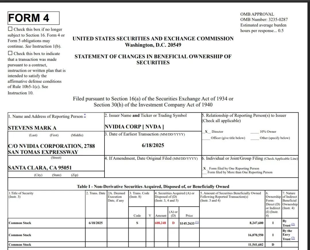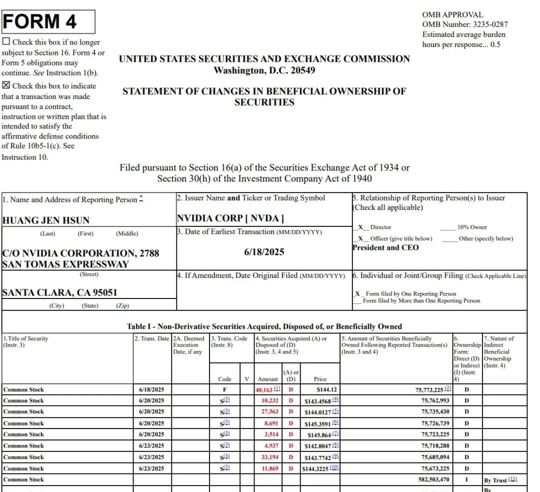 美国证券交易委员会(SEC)公布的文件显示,英伟达CEO黄仁勋开始了首轮减持英伟达股份的行动,也是为去年9月以来首次售股。文件表明,黄仁勋在美东时间6月20日和23日两个交易日内,累计出售了10万股英伟达股票,总规模近1450万美元。