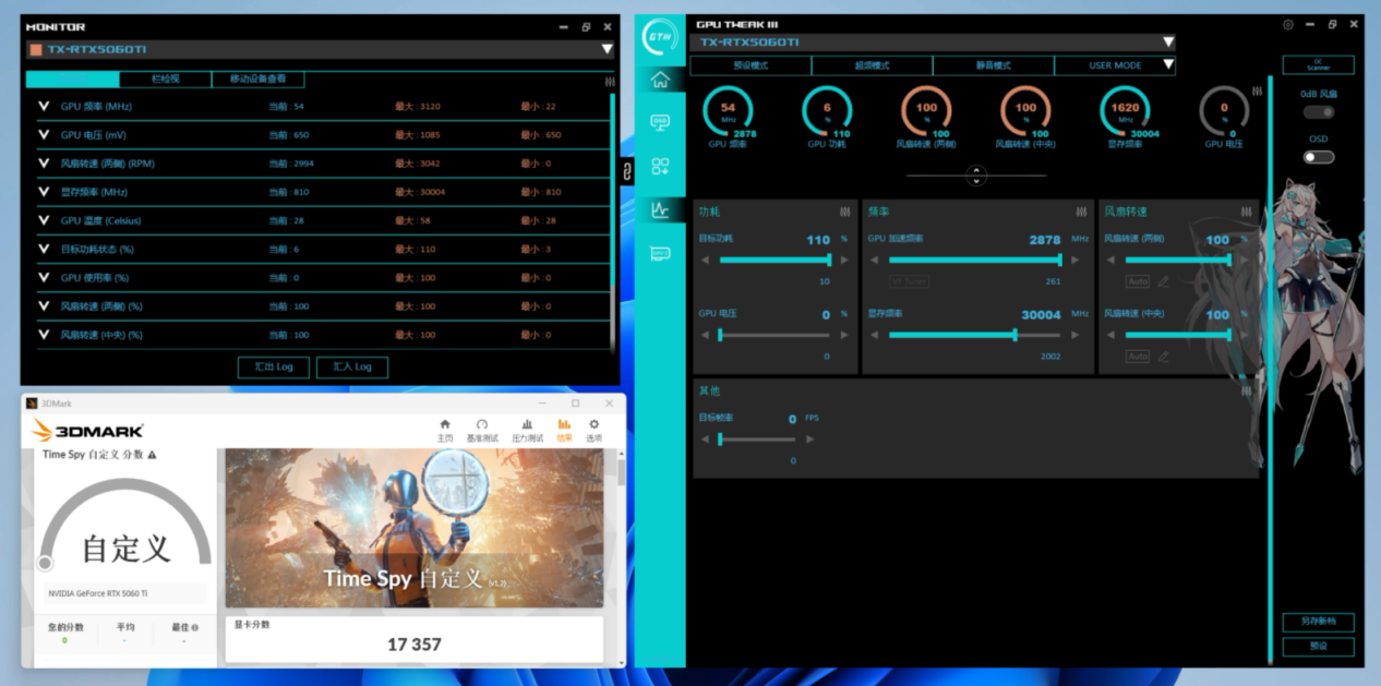 RTX5060Ti天选整卡功率上限为180W,实测考机可以跑满功率上限,此时GPU和显存温度分别为64.9℃和66℃,这个散热效果相当不错!在简单超频后,直接把GPU频率拉到了2878MHz上限,显存等效频率拉到30004MHz,实际的GPU峰值功率可达3120MHz之高,此时TimeSpyGPU得分达到了17357分,相对默认频率提升了大约6%,测试结果优秀!
