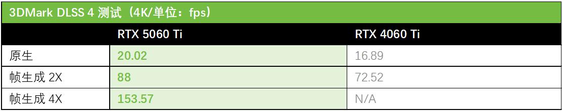 在游戏实测中,在DLSS4 + 4x多帧生成设置下,RTX5060Ti相对原生设置提升了接近7倍,相对RTX4060Ti的原生帧率提升了8倍,相对RTX4060 Ti开启2x帧生成也提升了112%。