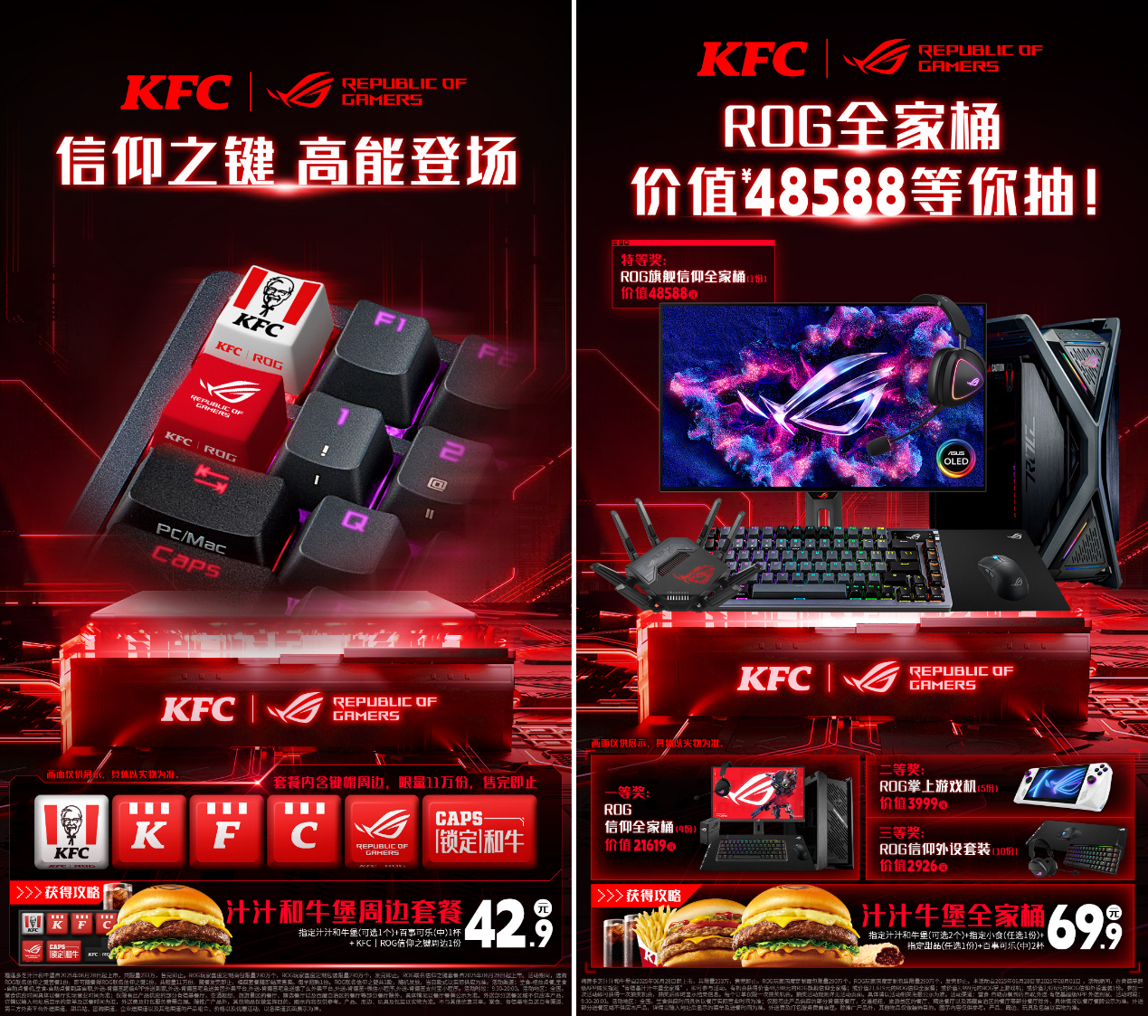 值得一提的是,ROG与肯德基跨界联名!推出首款周边「信仰之键」~玩家可以DIY你的专属信仰键盘,点亮你的电竞之路!购买ROG信仰之堡的联名套餐,更有机会赢取价值48,588元的ROG全家桶,快来参与吧!