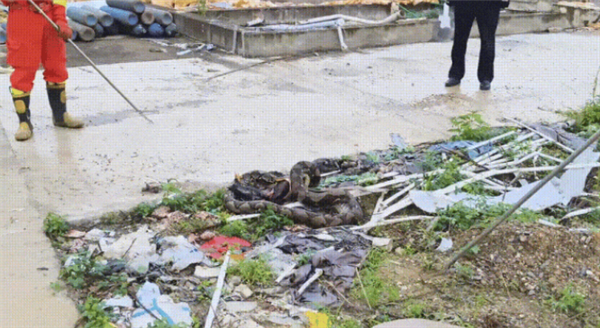 消防员抵达后得知,这条网纹蟒竟已将8只鸡吞入腹中!为避免蟒蛇突然伤人,消防员迅速行动,用捕蛇工具将它转移至路边。