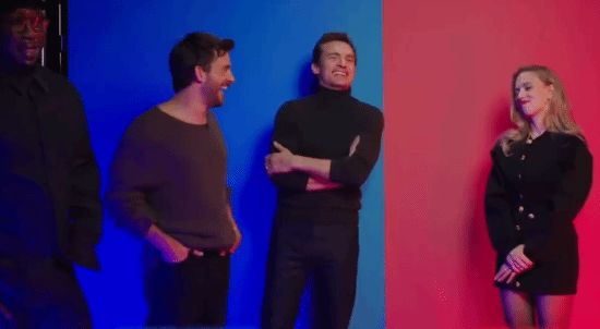 《侏罗纪世界:重生》演员斯嘉丽·约翰逊、乔纳森·贝利、马赫沙拉·阿里、鲁伯特·弗兰德宣传时玩二选一挑战。
