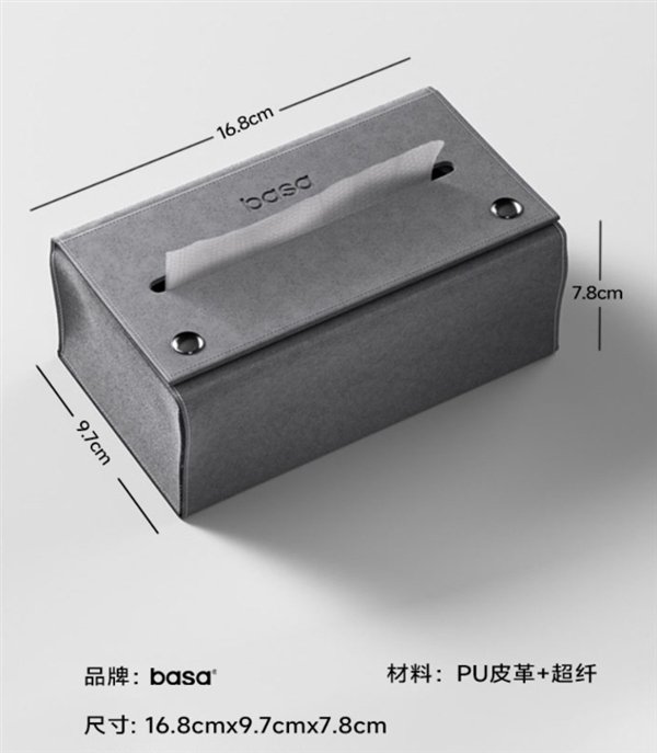 纸巾盒品牌为basa,材料为PU革+超纤,除了能放在车上之外,也能轻松磁吸在冰箱等金属材质上使用。