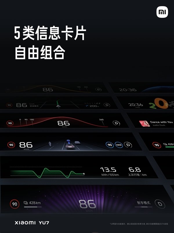 小米天际屏全景显示有一套全新的座舱交互体验:仪表、多媒体、地图、时钟、能耗五类信息卡片可自由组合,充分满足车主的个性化需求。