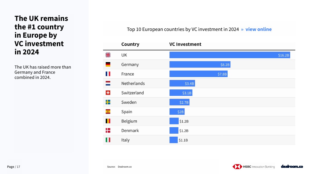 英国初创企业在2024年获得162亿美元投资,而德国和法国分别为82亿美元和78亿美元。