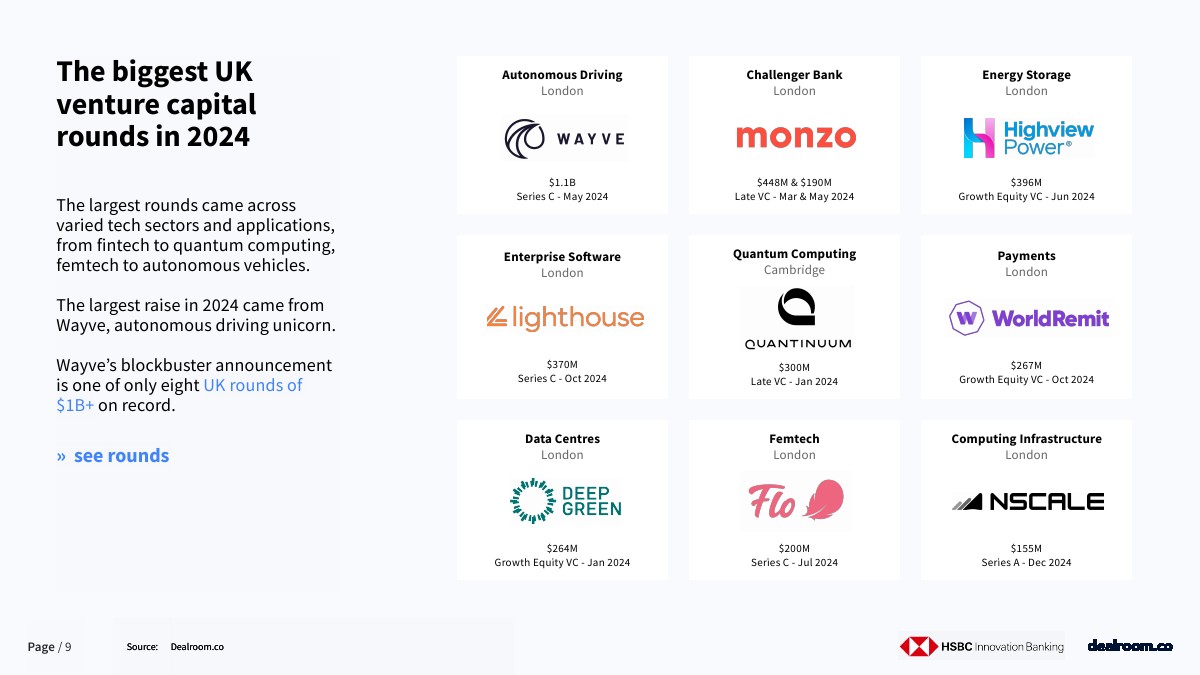 2024年英国最大的风险投资:规模最大的几笔融资涉及不同的科技领域和应用,从金融科技到量子计算,从女性科技到自动驾驶汽车。