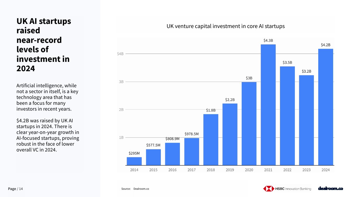 对英国初创企业的投资正在上升。英国人工智能初创公司在2024年获得42亿美元投资。2024年,英国27%的风险投资是由人工智能初创公司获得的,而2014年这一比例为7%。