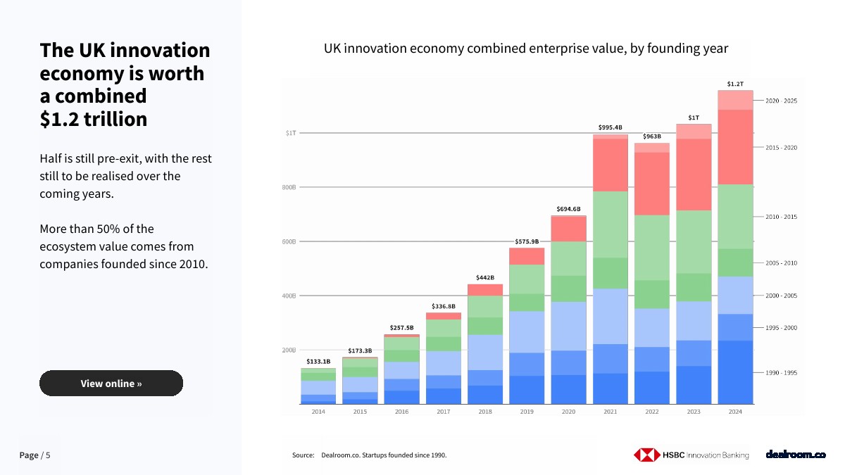 英国科技创造了180万个就业岗位。创新是英国强大的经济引擎。超过50%的生态系统价值来自于2010年以后成立的公司。