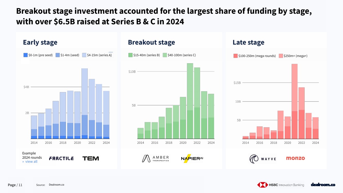 成长型投资占各阶段融资的最大份额,2024年在B轮和C轮融资中获得了超过65亿美元投资。