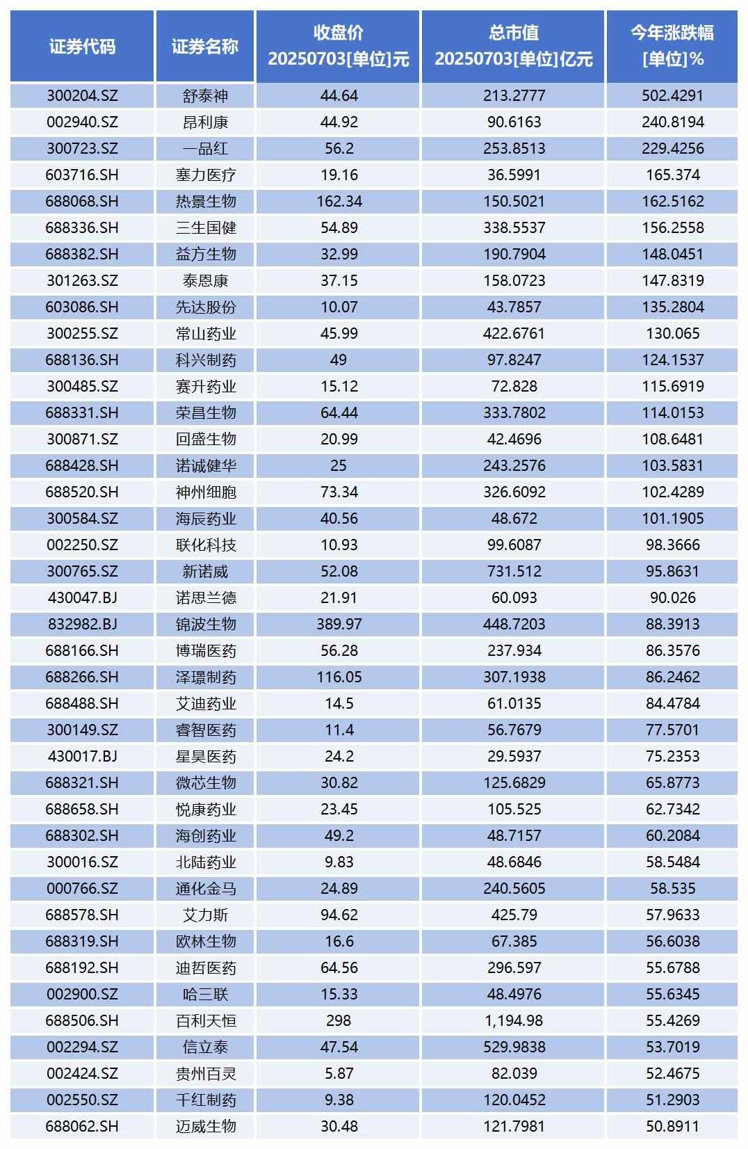 从二级市场表现看,今年以来,涨幅超过50%的有40家上市公司,其中,舒泰神、昂利康、一品红、塞力医疗、热景生物、三生国健、益方生物、泰恩康、先达股份、常山药业、科兴制药、赛升药业、荣昌生物、回盛生物、诺诚健华、神州细胞、海辰药业均成功实现**。