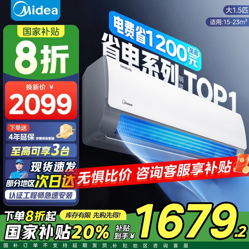 美的酷省电空调1.5匹新一级能效,节能静音空气健康