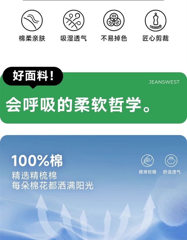 匠心剪裁+棉柔亲肤+吸湿透气+不易掉色。100%棉,精选精梳棉,每朵棉花都洒满阳光。活性印染工艺,久洗不易掉色。