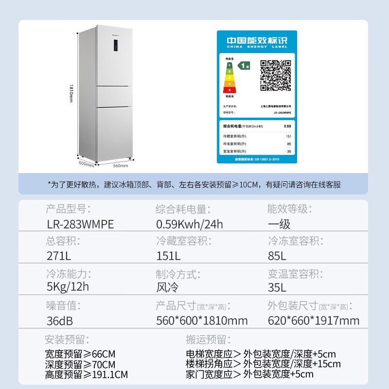 上菱283三开门冰箱风冷无霜节能省电租房优选