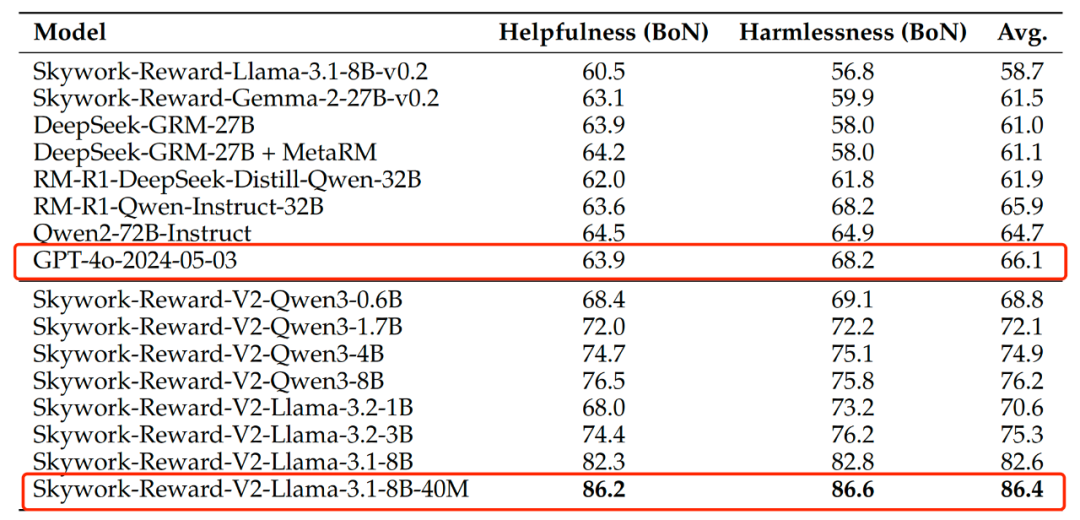 在另一客观正确性评估基准 PPE Correctness 上, Skywork-Reward-V2 全系 8 个模型在有用性(helpfulness)和无害性(harmlessness)指标上均展现出了强大的 BoN(Best-of-N)能力,超越此前 SOTA 模型 GPT-4o,最高领先达 20 分。