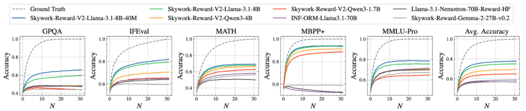 另外,从下面 PPE Correctness 五项高难度任务的 BoN 曲线可以看到,Skywork-Reward-V2 表现出持续正扩展性,均达到 SOTA。