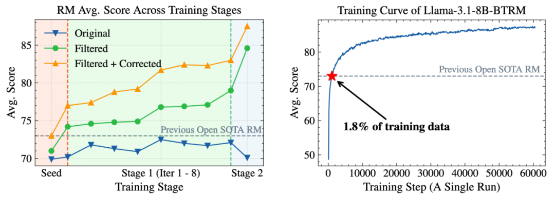 图左展示了整个数据筛选流程(包含原始数据、过滤后数据、过滤后数据 + 校正偏好对三个阶段)中奖励模型得分的变化趋势;图右展示了 Skywork-Reward-V2-Llama-3.1-8B 奖励模型的初始版本(即 Llama-3.1-8B-BTRM)在最终训练轮次的平均得分。