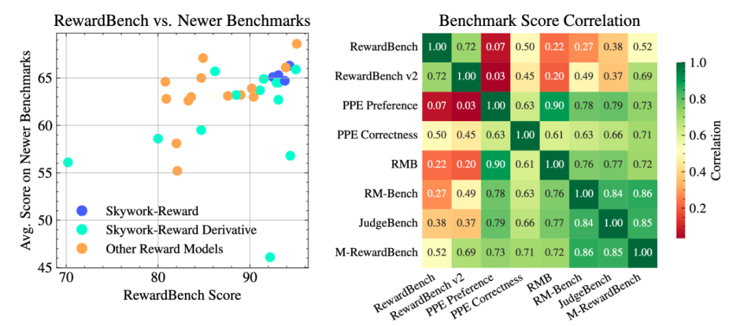 左图:31 个顶尖开源奖励模型在 RewardBench 上的能力对比;右图:分数的相关性 —— 可见很多模型在 RewardBench 上性能提升后,在其他 Benchmark 上成绩却「原地踏步」,这可能意味着过拟合现象。
