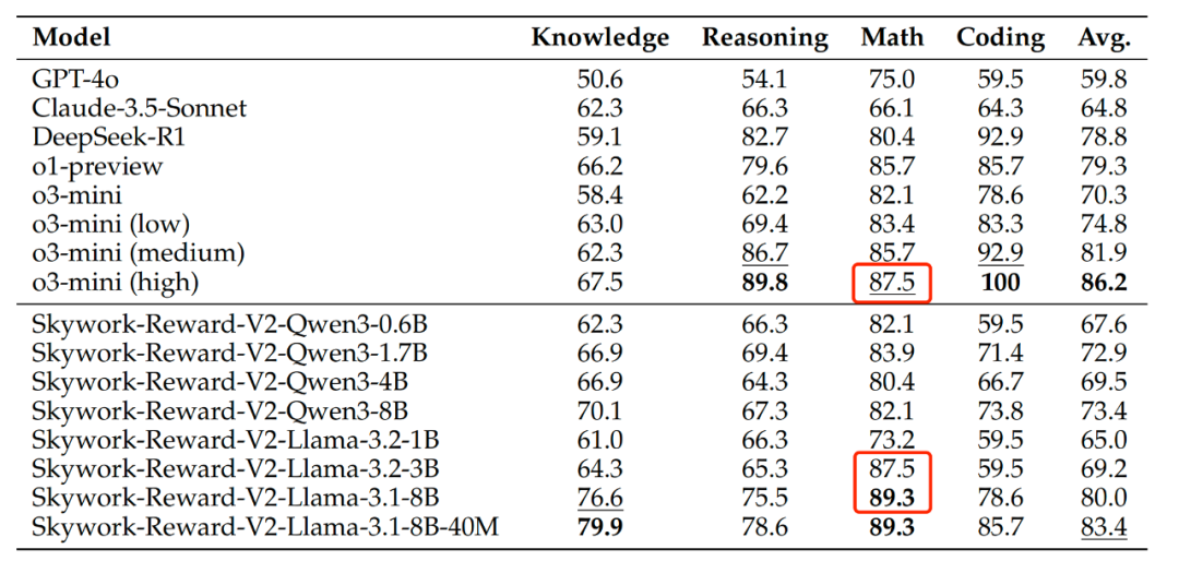 在客观正确性评估基准(JudgeBench)上,Skywork-Reward-V2 整体性能虽弱于 OpenAI o 系列等少数专注于推理与编程的闭源模型,但在知识密集型任务上优于所有其他模型,其中 Skywork-Reward-V2-Llama-3.2-3B 的数学表现达到了 o3-mini (high) 同等水平,Skywork-Reward-V2-Llama-3.1-8B 更是完成超越。