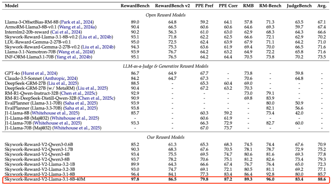 Skywork-Reward-V2 系列共包含 8 个基于不同基座模型和不同大小的奖励模型,参数规模从 6 亿到 80 亿不等,它在七大主流奖励模型评测榜单上全部获得了第一。