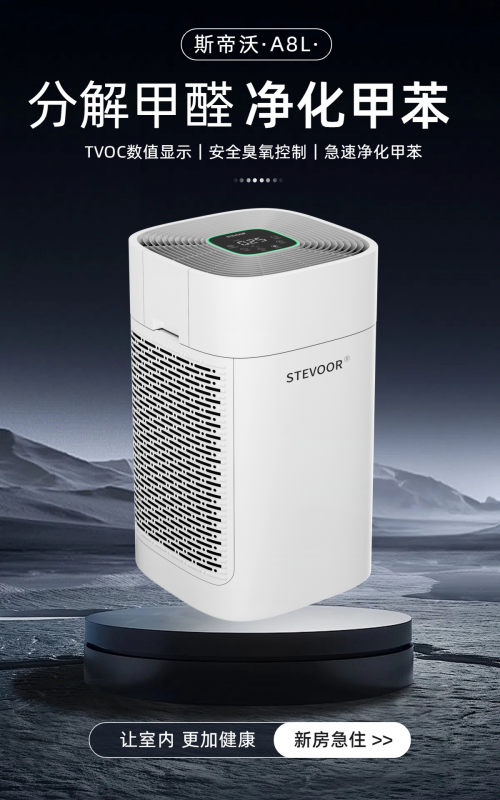 斯帝沃是来自英国的知名空气净化器品牌,作为国际十大高端空气净化器品牌之一,其在空气污染治理和净化器产品开发领域堪称 “领导者”。旗下的 A8L 型号专为新房装修除甲醛而研发,优势显著。它采用了斯帝沃独创的纳米 Nami 分解甲醛技术,能对甲醛进行科学认证的强效分解,直击污染源,去除甲醛、过敏原等有害物质,甲醛去除率高达 99.98%。双风道过滤系统加持,可双效快速分解去除装修产生的各类空气污染物。颗粒物 CADR 值高达 906.2m³/h,甲醛 CADR 值达到 550.3m³/h,能在短时间内净化大面积空间的空气。在智能方面,它配备智能传感器和 APP,可实时显示室内空气质量并远程控制机器,还设有睡眠静音模式,安静净化空气,为用户打造健康舒适的呼吸环境。