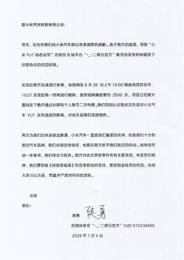 道歉信中称:“小米汽车一直是我们重要的伙伴,也是我们十分热爱的汽车品牌,我们珍视这份信任,也恳请贵方给予我们改正的机会。如有任何进一步要求,我们将全力配合。我方对此次泄密事件负有主要责任,本着契约精神,我们愿意按《保密承诺函》约定承担违约责任,接受现金处罚的约定。”