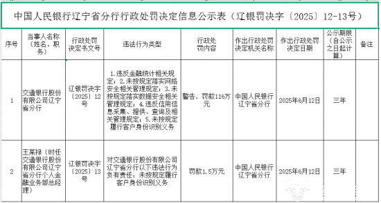 据央行辽宁省分行披露的信息显示,交通银行辽宁省分行存在五项违法行为。最终,该行被警告并罚款116万元。