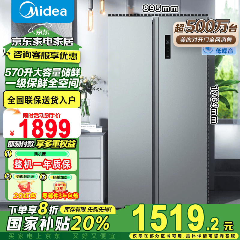 美的570升变频节能电冰箱,风冷无霜大容量双开门家用优惠价1519元