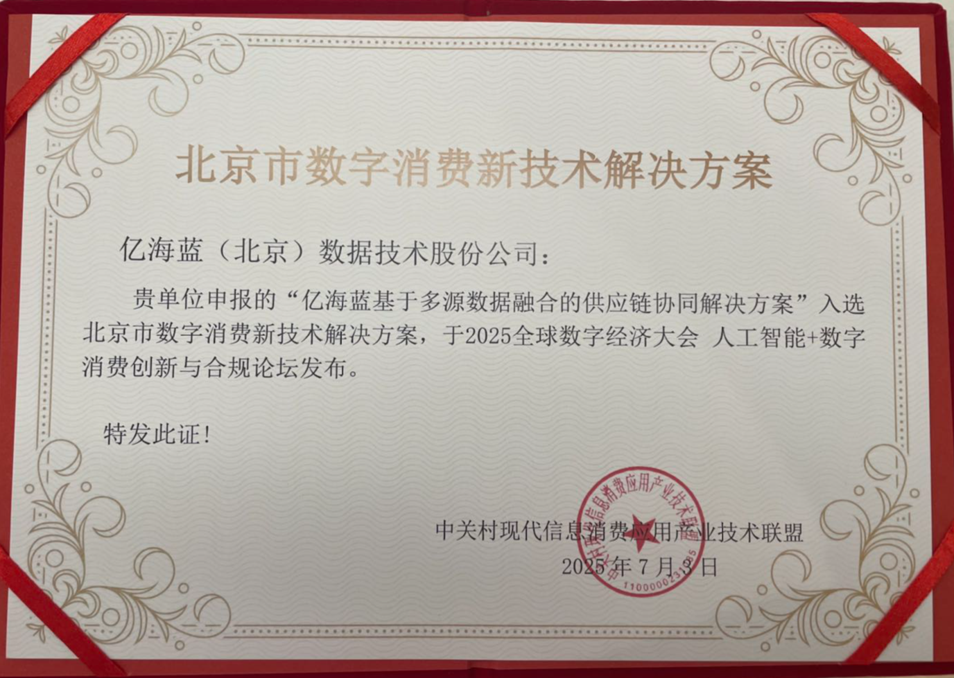 在大会“AI+数字消费创新与合规”分论坛上,亿海蓝“基于多源数据融合的供应链协同解决方案”入选北京市数字消费新技术解决方案。该方案深度整合多源供应链数据,打破供应链各环节的数据壁垒,显著提升企业供应链的协同效率与响应速度,为数智化供应链管理提供了创新范本与实践标杆。