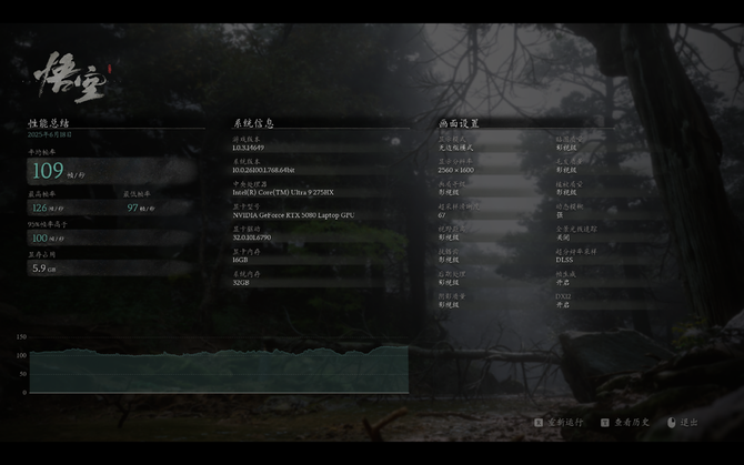 最后,在压力最大的《黑神话:悟空》中,我们同样开启DLSS质量档与两倍帧生成。在虚幻五的超高画质下,是超高的性能压力。最终,暗影精灵MAX获得了平均109帧,95%帧数高于100的成绩,同时动作延迟几乎无感,完全支配了这款超高压力的3A大作。