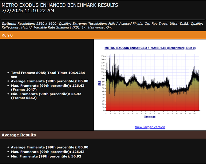 作为强制开启光追的显卡杀手,《地铁:离去》的压力不可谓不大。在半小时的连续Benchmark测试后,暗影精灵MAX跑出了平均85.8帧的成绩。要知道,这可是在2,5K最高画质、光追全开的情况下跑出的帧数,强悍得不可思议;同时,键盘最高温度仅44.2度,腕托温度32.6度,属于温热的状态,