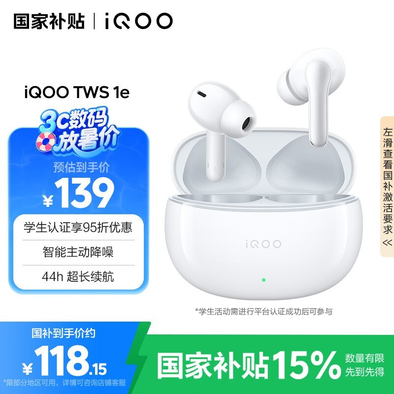 iQOO TWS 1e蓝牙耳机京东促销,到手118元