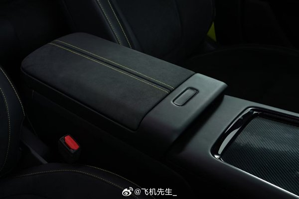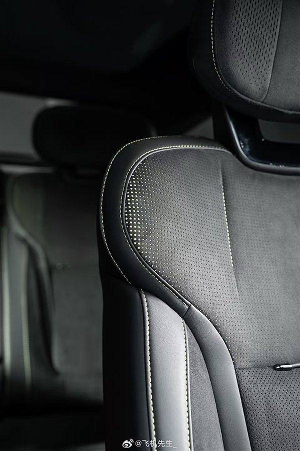 细节来看,黑色为主的内饰会有黄绿色的缝线,同时还大面积使用了类似麂皮的材料营造高级感,座椅采用打孔工艺,预计加热和通风必不可少,至于按摩,理论上也不会缺席。