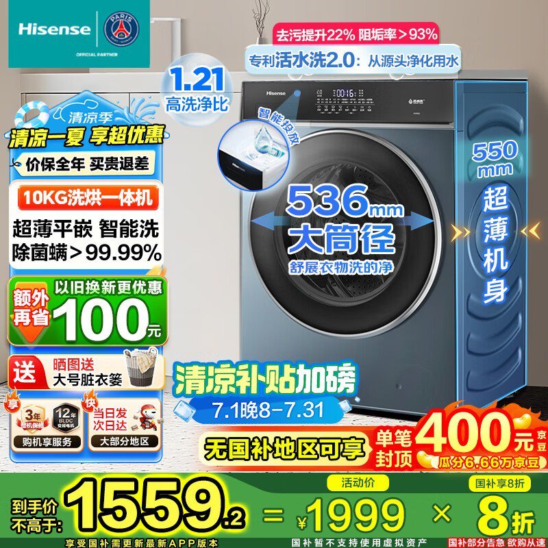 海信滚筒洗衣机HD10IE2促销:洗烘一体智能触控,10公斤大容量直降685元