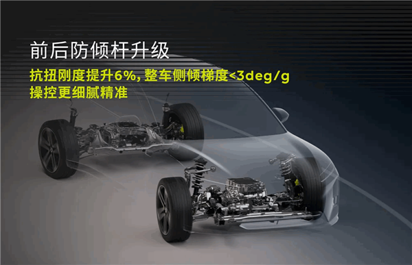 车辆底盘同步进行了升级,前后防倾杆升级后,抗扭刚度提升6%,整车侧倾梯度<3deg/g,操控更细腻精准。专属运动化底盘软件调校,可让弯中车身极限更稳定。