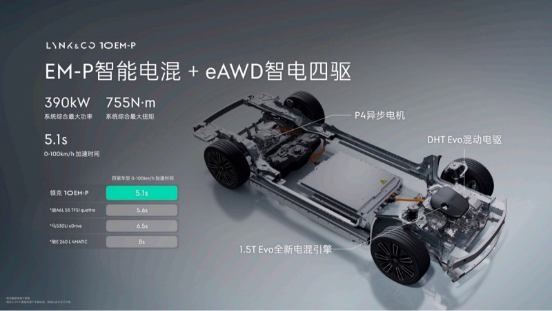 动力方面,领克10 EM-P搭载全新EM-P智能电混系统,由1.5T全新电混发动机和DHT Evo 混动电驱组成,全系标配双电机四驱,系统综合功率 390kW,匹配3DHT变速箱,官方0-100km/h加速时间为5.1s,亏电油耗低至4.2L/100km。