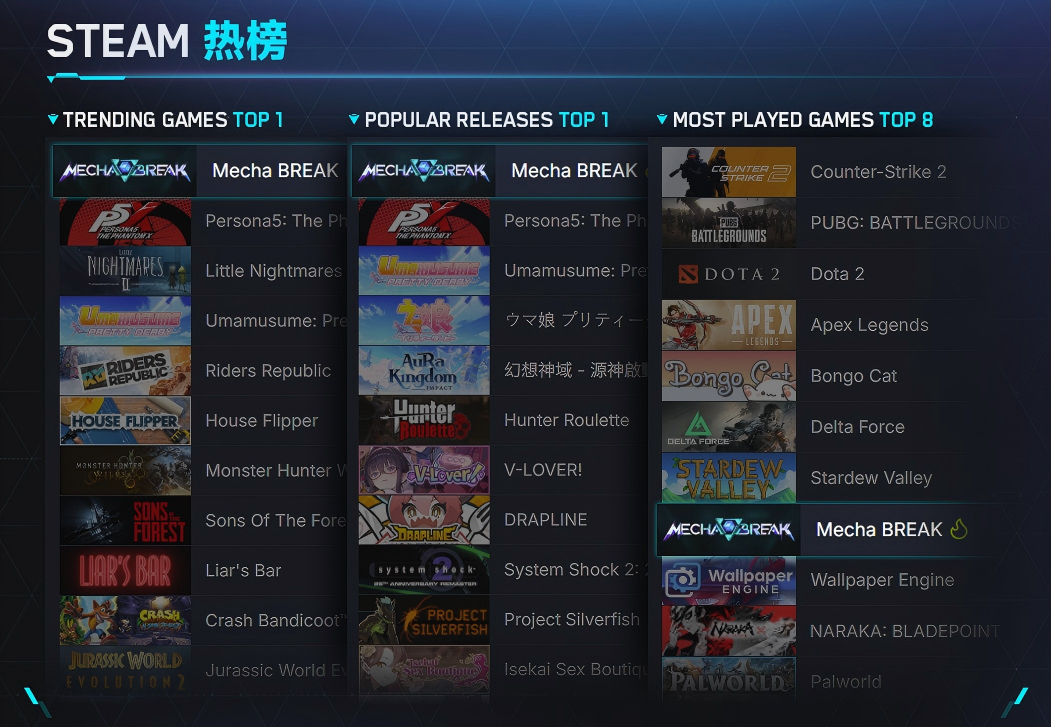 游戏上线后数小时,Steam在线数很快就突破了13.2万,登上了Steam热销榜前6,新游榜第一。机甲爱好者们热情地谈论着游戏的方方面面,分享自己驾驶爱机的精彩瞬间或是精心打造的涂装方案,欢天喜地如同过节一般。