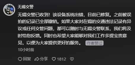 针对此事,无锡交警在报道评论区进行了回应:该设备系统出错,目前已修复,之前被误拍的记录已全部撤销。