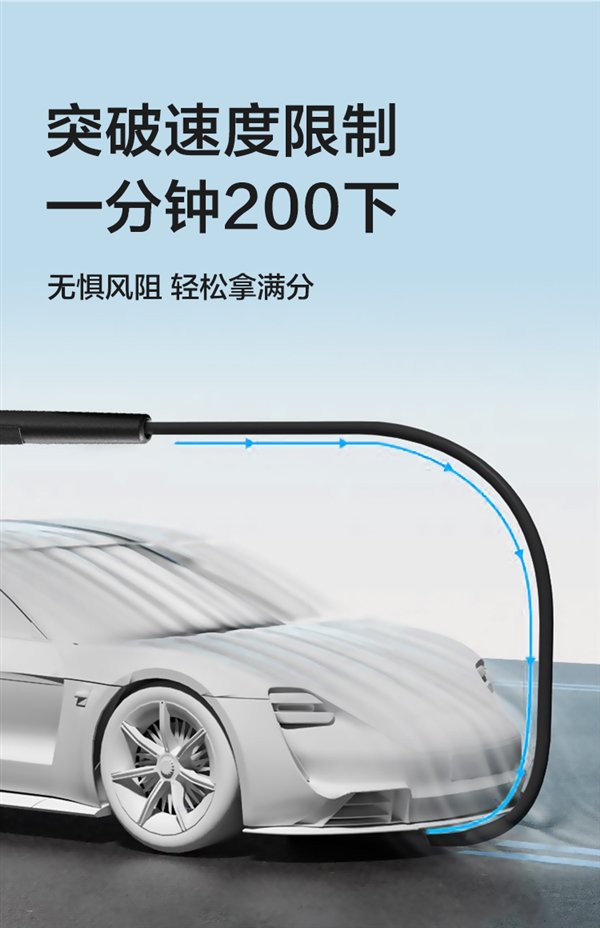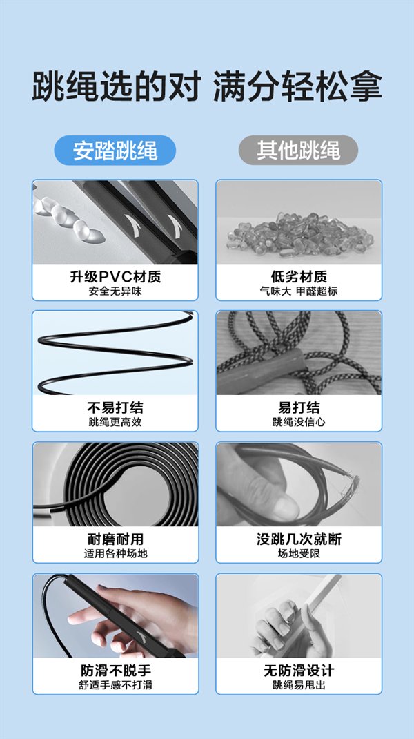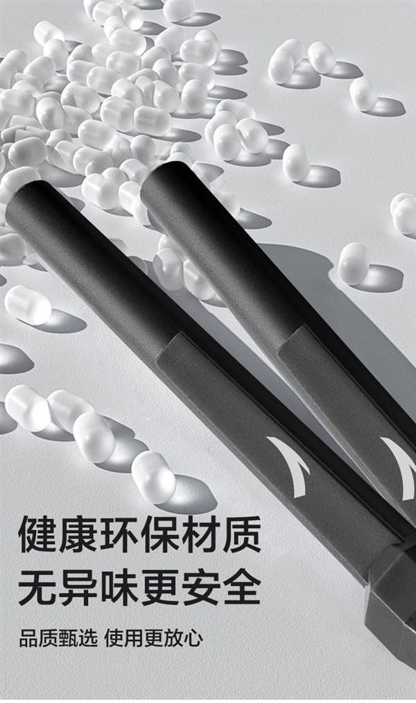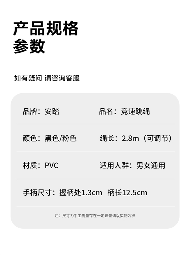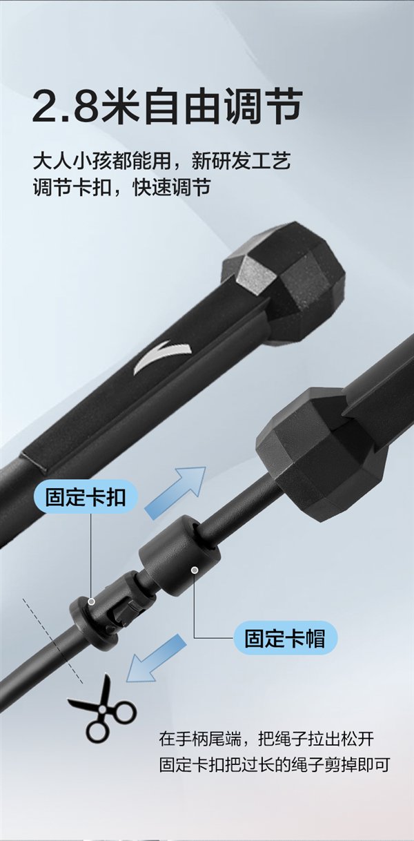 2.8 米绳长可调节,轻重 90g,不打结,不绕绳,轻盈飘逸不拌脚,舒适防滑手柄。