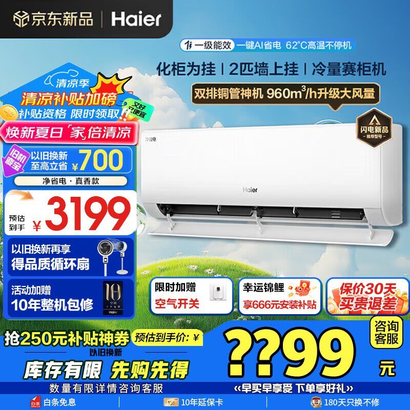 海尔2匹新一级能效壁挂空调到手价2174元