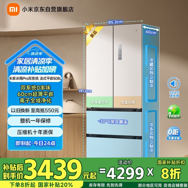 米家508L风冷多门冰箱智能节能补贴价3439元