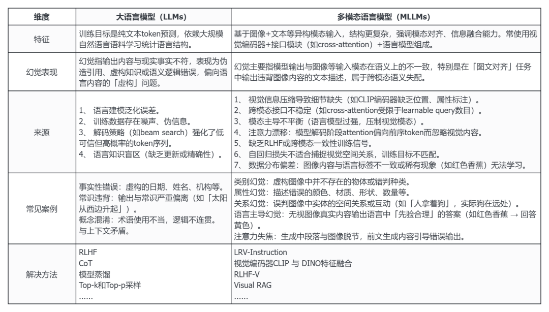 2、相较于传统大语言模型(LLMs)中对事实性错误的讨论,多模态模型(MLLMs)幻觉不仅涉及语言生成的偏差,更体现为跨模态的语义失配,即模型「看图说话」时对图像理解出现偏差,生成内容偏离甚至虚构了视觉细节。