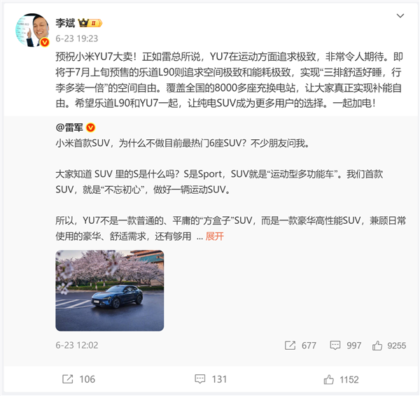 此外,在小米YU7发布前,李斌曾表示,YU7致力于达到极致的运动性能,这一点备受期待,而蔚来乐道L90则另辟蹊径,专注于空间和能耗的极致优化,旨在实现宽敞的乘坐空间和高效的能源利用。