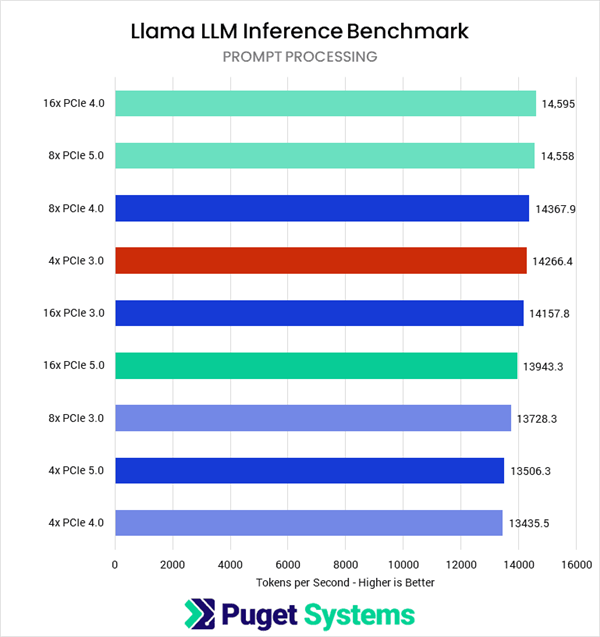同样,在Llama.cpp的AI基准测试中,即使GPU的PCIe带宽较低,性能也未受到明显影响。这是因为这些应用更依赖于GPU的显存。
