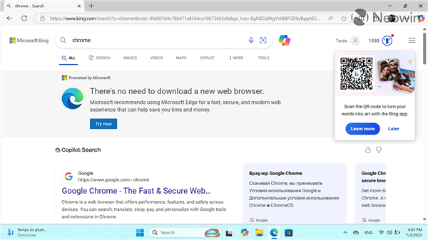 当用户通过Bing搜索Chrome时,不会再看到声称“无需下载其他浏览器(请使用Edge)”的横幅,也不会再有弹窗试图留住用户,巨大的广告横幅也彻底不见了。