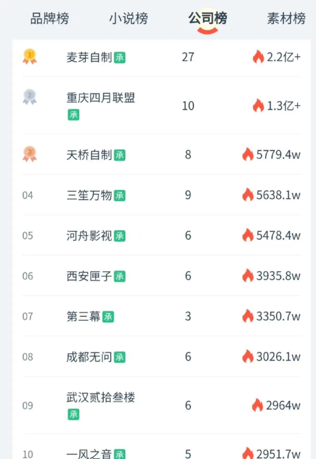 麦芽自制和重庆四月联盟两家承制公司,连续五月霸榜