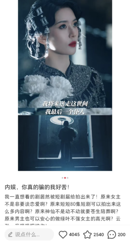 掐脖霸总成为过去时,年轻的女性用户爱上新故事。比如《引她入室》,丢掉了陈旧的雌竞套路,讲述了女性联手复仇的新故事。比如《谁在说朕坏话》,在常见的“听见心声”梗中融入双重人格元素,让人耳目一新。精良的服化道,韩剧质感的细腻画面,唯美浪漫的氛围……微短剧逐渐撕掉“土味”标签。