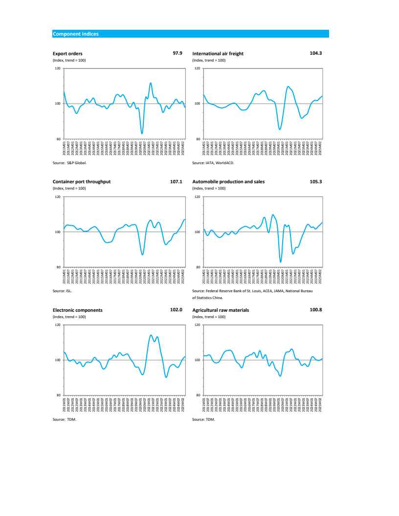 从分项数据看,增长动能存在显著分化。运输相关指数表现强劲,航空货运与集装箱运输指数分别录得104.3和107.1。汽车产品(105.3)和电子元件(102.0)指数亦高于趋势水平。然而,最具前瞻性的新出口订单指数已跌至97.9,落入收缩区间,预示未来需求疲软。