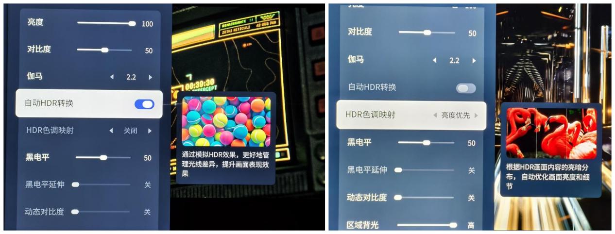软件算法方面,超动态光影仿生算法可以针对不同的影片内容进行优化,让SDR效果接近HDR,而HDR则能够带来更好的效果,从实测画面来看,无论是SDR格式内容还是HDR格式内容,经过算法优化后,其画面的明暗场细节和对比度都有了比较明显的提升,让观影体验更出色。